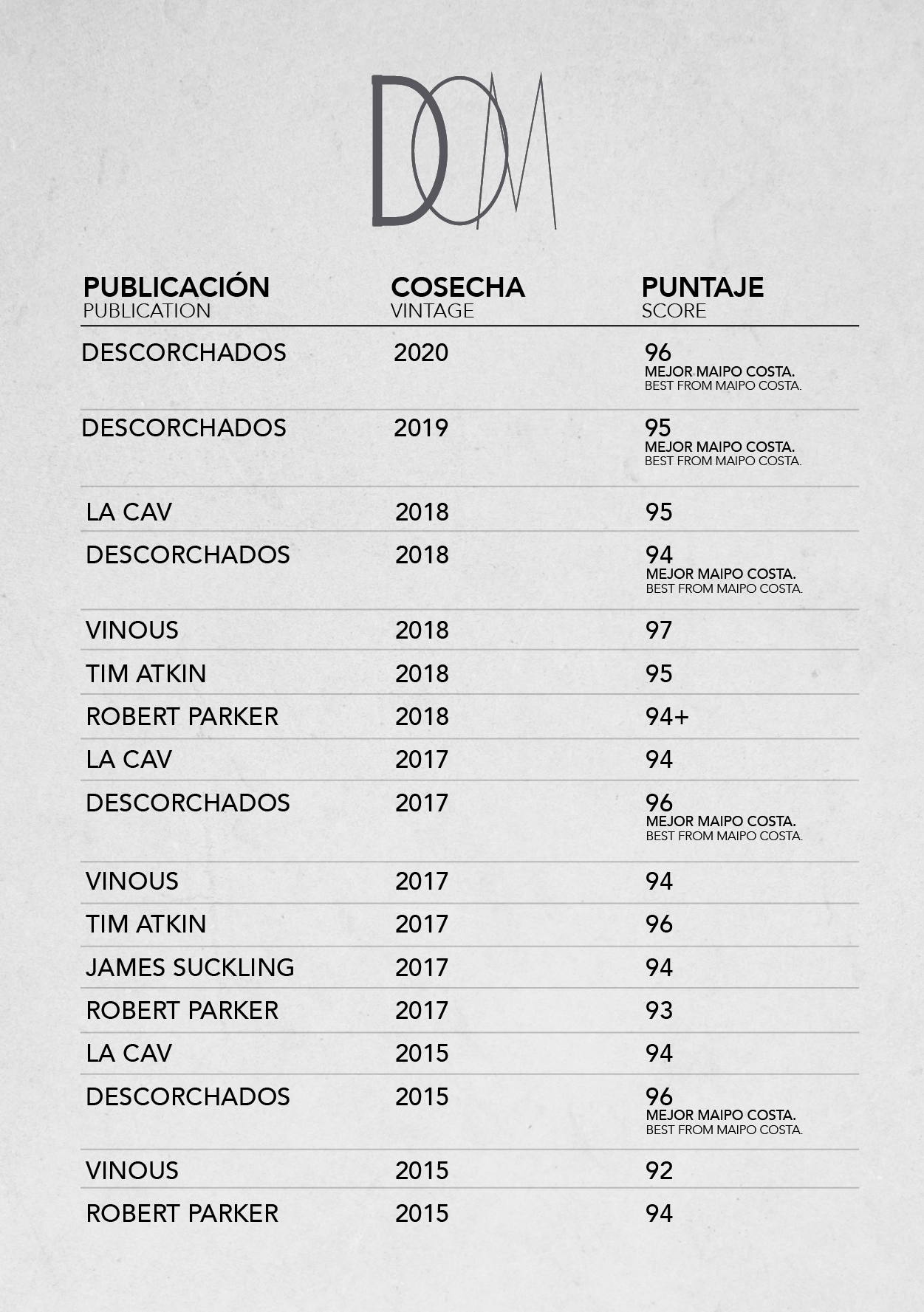 En nariz presenta notas intensas de grosella negra y menta con toques de bálsamo, laurel y roble. Jugoso en boca, con gran frescor, una textura amable y taninos finos y activos que le dan forma a un Cabernet clásico, sabroso y con un largo y muy elegante final.