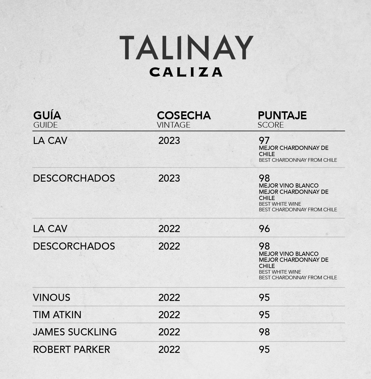 De color amarillo pálido, Caliza es un vino con gran profundidad, largo, tenso, jugoso y con nervio. Notas salinas, minerales y gran verticalidad en boca. Sin duda un vino con carácter, en el que se siente toda la fuerza del viñedo Talinay.
