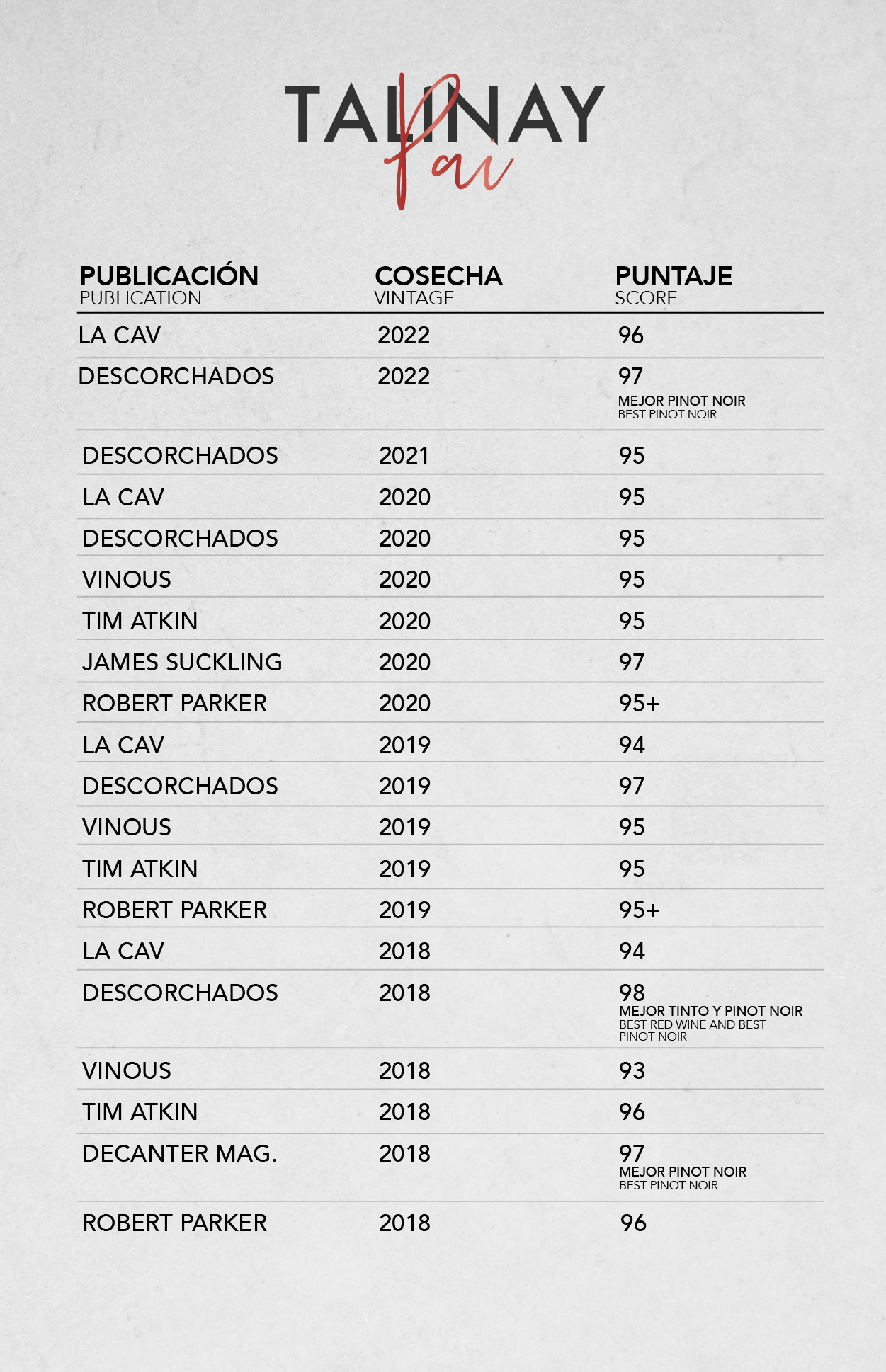 De color cereza silvestre, en nariz transmite recuerdos de tierra húmeda, sotobosque, frutos rojos y hierbas, más toques de rosas, especias dulces y sándalo. En el paladar se siente la tiza, es firme, tenso y con una frescura acertada y un paso por boca amable. Este es un vino directo, equilibrado, que muestra la salinidad y la austeridad de Talinay con gran complejidad y elegancia. Sutil, delicado y refinado, con taninos maravillosamente matizados. Este vino está llevando esta variedad a un nuevo nivel en Chile.